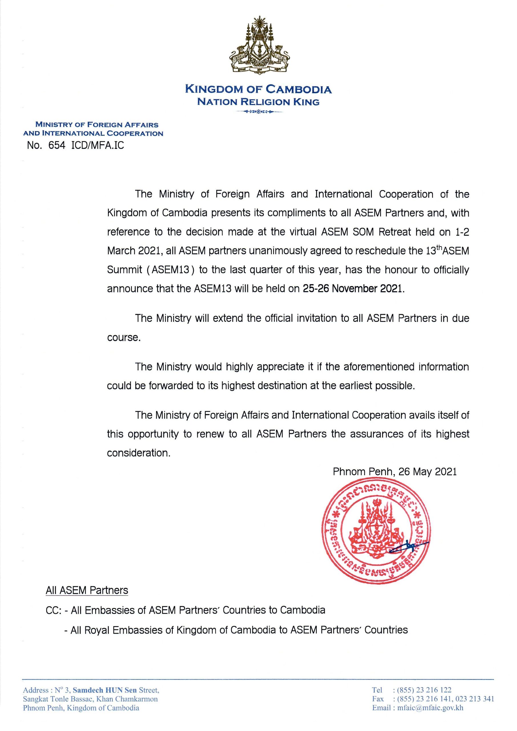 The 13th ASEM Summit (ASEM13) was successfully held on 25-26 November 2021 via videoconference.