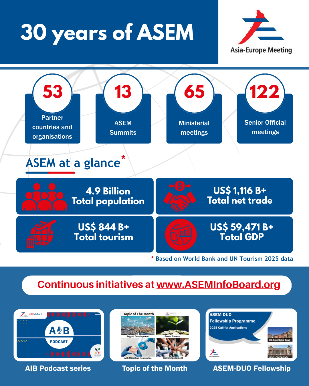 Records and visibility are important in helping raise awareness of ASEM’s role and outcomes. In this context, the ASEM InfoBoard (AIB) serves as the official digital platform of ASEM. Developed in 2004 and administered by the Asia-Europe Foundation (ASEF), AIB was established as a repository for information on ASEM meetings, activities and past initiatives, for access to government officials and the public, the AIB has since expanded its format and approach to become a broader and more engaging website.
